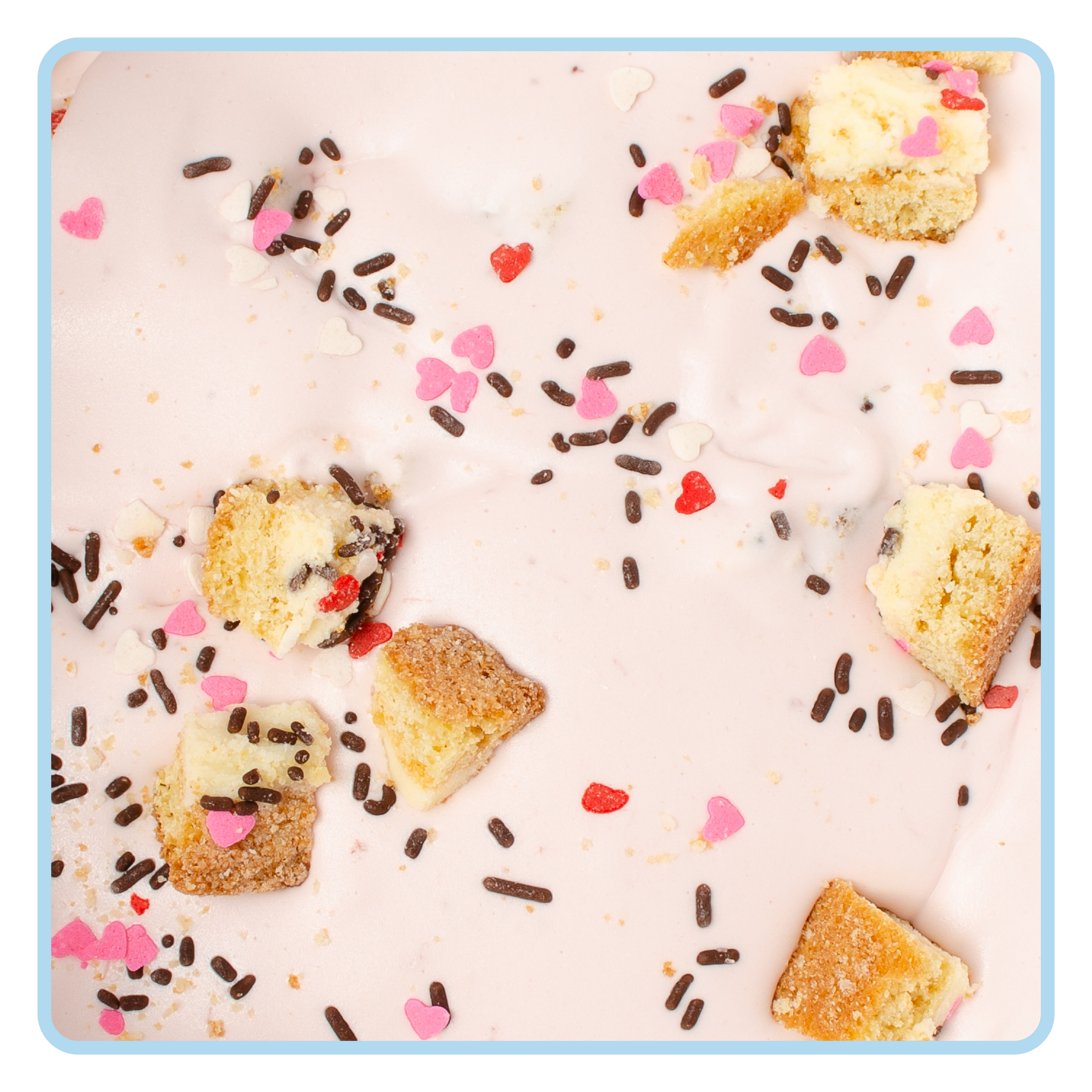 Cupid's Favorite CookieStrawberry ice cream with frosted sugar cookie pieces, heart sprinkles, and chocolate sprinkles