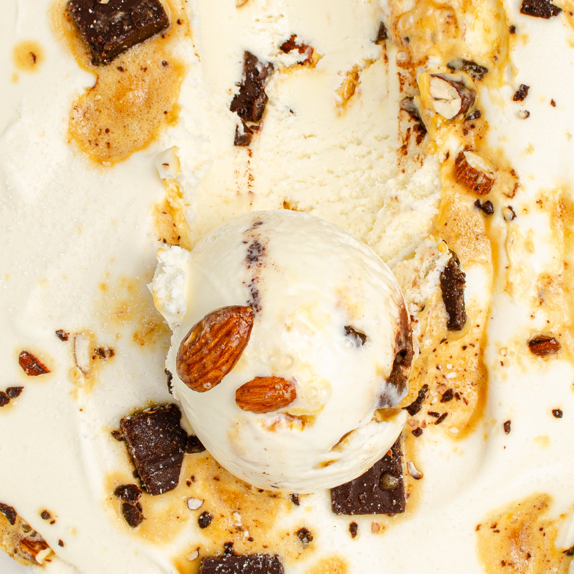 Sweet, buttery almond brittle and dark chocolate ganache layered throughout our creamy vanilla ice cream