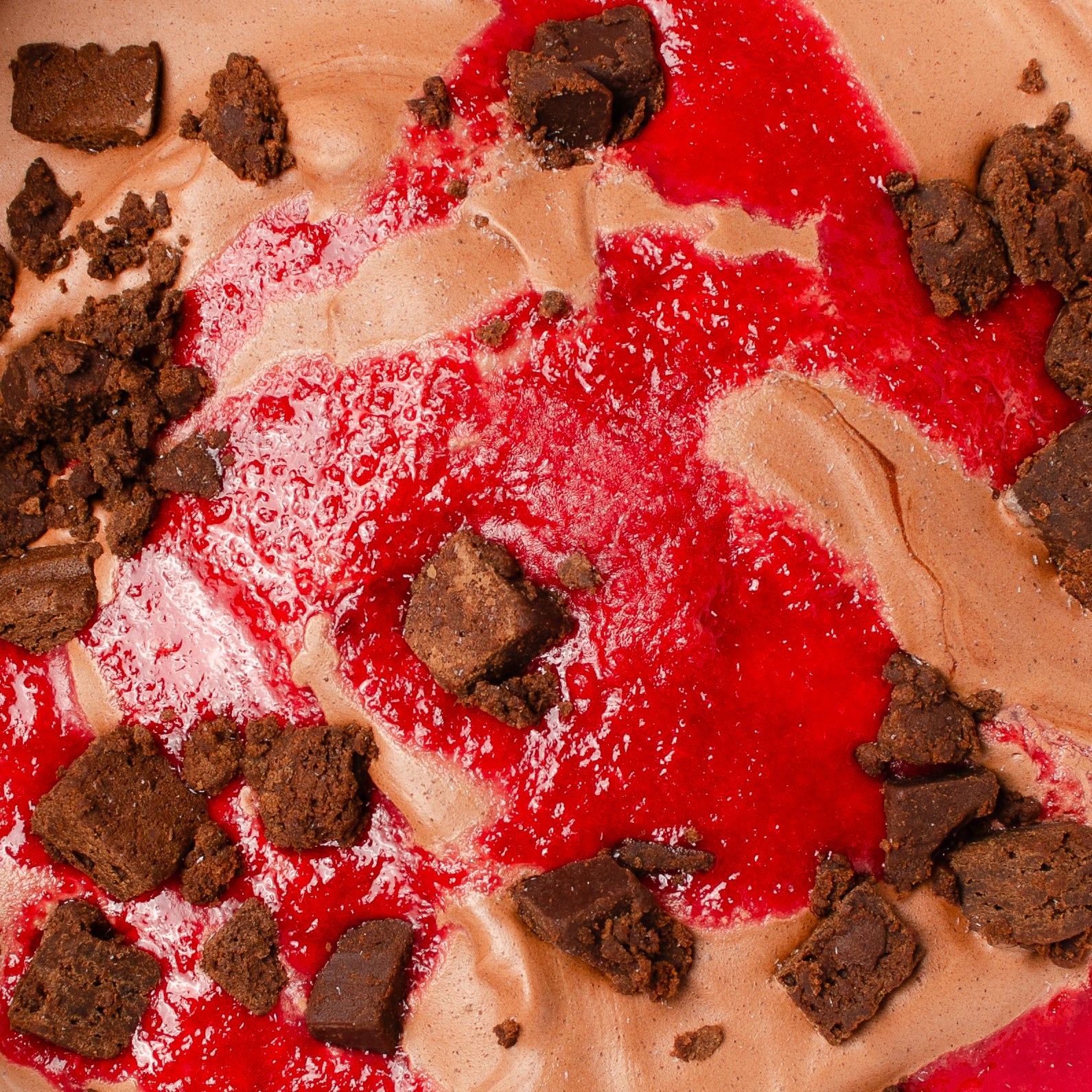Dark chocolate ice cream with brownie pieces, fudge, and cherry pie swirls