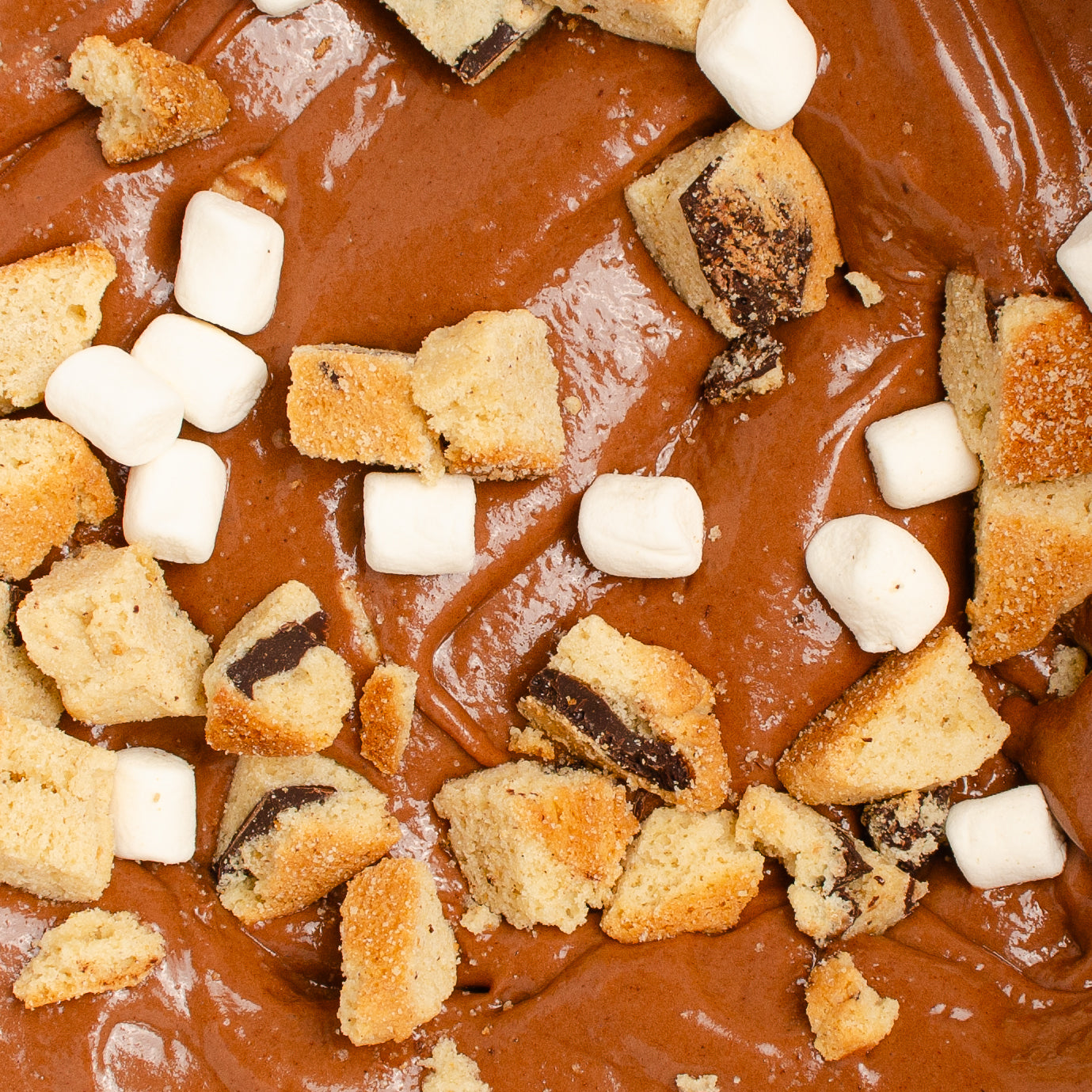 Hot chocolate ice cream with peppermint chocolate chip cookie pieces and mini marshmallows. Optionally topped with whipped cream.